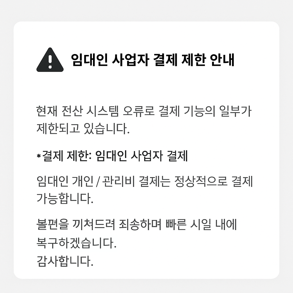 계약 상대방이 사업자인 경우 결제일 기준 3영업일이 소요되기 때문에 만약 3영업일 이후에 결제하셨을 경우 임대인이 미납고지서를 보내는 경우가 종종 있습니다. 임대인님에게 송금예정일에 입금된다고 말씀해주세요.