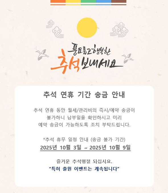 - 임대인 개인 및 관리비: 1영업일 이후 14:00시 예약 송금 가능