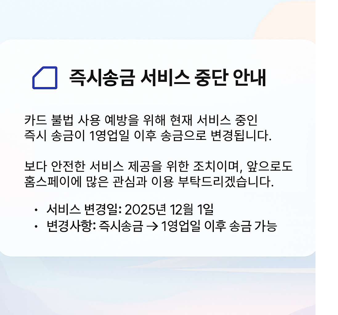 즉시 송금은 카드깡 등 일부 PG사들이 불법으로 악용하고 있으므로 여신 전문금융업법에 따라 예약송금만 시행하고 있습니다.