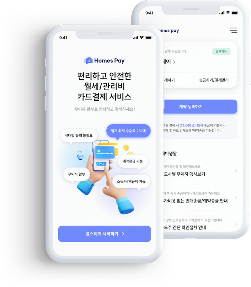 홈스페이는 주택, 상가, 사무실, 단기임대, 기숙사 등 모든 부동산 계약의 월세, 관리비를 결제하실 수 있습니다.